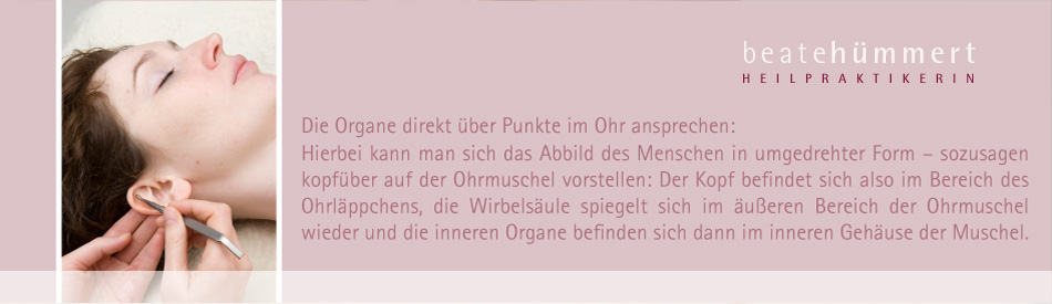 Das Ohr repräsentiert alle Reflexzonen des menschlichen Körpers und ist hervorragend zur Therapie geeignet. Die Ohr-Akupunktur der alten Chinesen und die Auriculotherapie des französischen Arztes Nogier sind seit langem bekannte und geschätzte Therapiemethoden.
